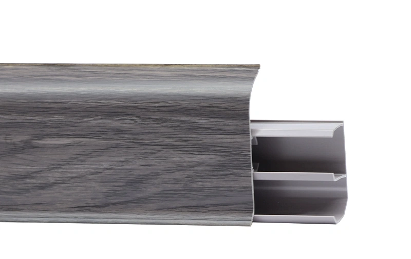 Напольный плинтус с высоким профилем в 70 мм, острыми краями и ярким декоративным элементом, гармонирующим с современным и индустриальным дизайном помещений.